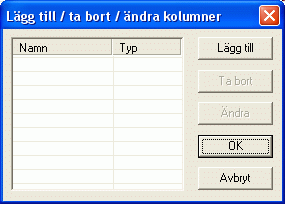 Du kan skapa nya kolumner genom att klicka på knappen "Lägg till". Kolumnerna bestämmer vilken sorts data som kan sparas i en rad. Om du tex vill skapa ett telefonregister så behöver du en kolumn för namn och en annan kolumn för telefonnummer.