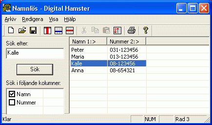 Digital Hamster har en sökfunktion som hjälper dig att hitta rätt i stora register. Välj Redigera - Sök från huvudmenyn. En sidopanel visas.