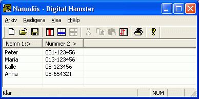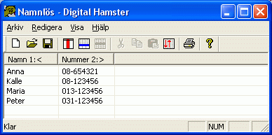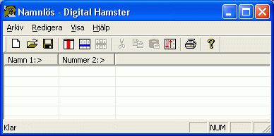 Öppna och spara filer fungerar som i de flesta andra program. Välj Arkiv - Öppna i huvudmenyn för att läsa in ett register från fil. Välj Arkiv - Spara för att spara ett register, och Arkiv - Spara som för att spara ett register i en ny fil. Man kan bara ha ett register öppet i taget. Digital Hamster varnar dig om du är på väg att avsluta programmet utan att spara. Glöm inte att ta säkerhets- kopior på dina filer med jämna mellanrum. Olyckor inträffar när man minst anar det.