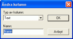 | Text | En textkolumn används för att spara en text med variabel längd. Textkolumner är dom enda kolumner som kan vara tomma. Textkolumner kan sorteras i alfabetisk ordning. |