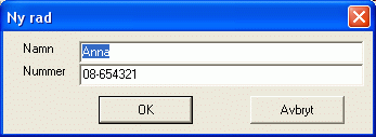 Dialogrutan varierar i utseende beroende på vilka kolumner som finns i registret. Fyll i ett värde för varje kolumn och klicka OK. En ny rad visas längst ner i registret i huvudfönstret. Upprepa proceduren för att lägga till flera rader.