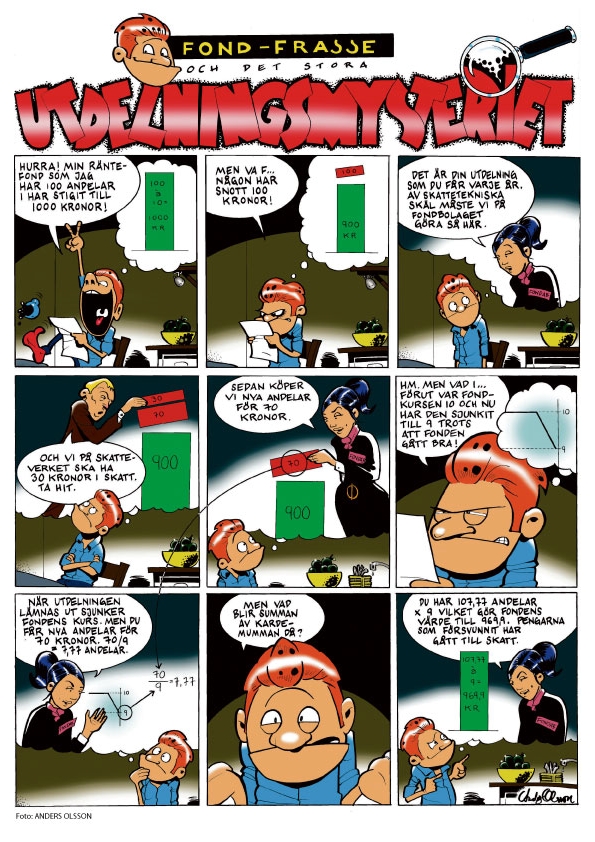 DN har tagit en seriefigur till hjälp för att förklara hur utdelningar i fonder fungerar. Hur fondkursen påverkas av utdelning förklaras även i manualen till Krösus, fast utan hjälp av seriefigurer.